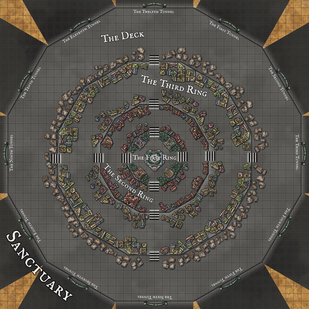 Sanctuary is a walled city divided into three concentric dodecagons known as the Rings which tower over a twelve-sided field derisively referred to as the Deck.